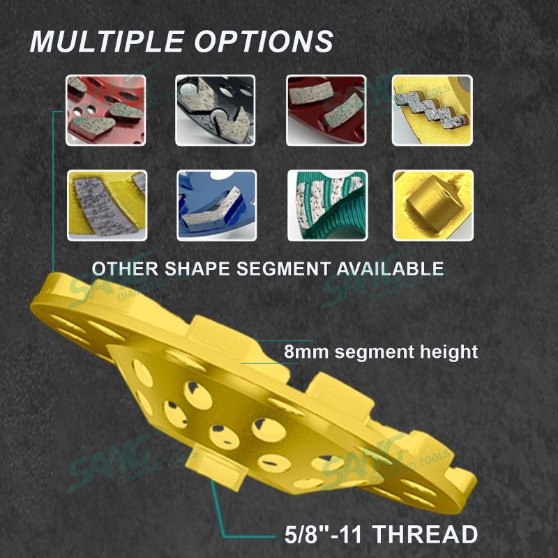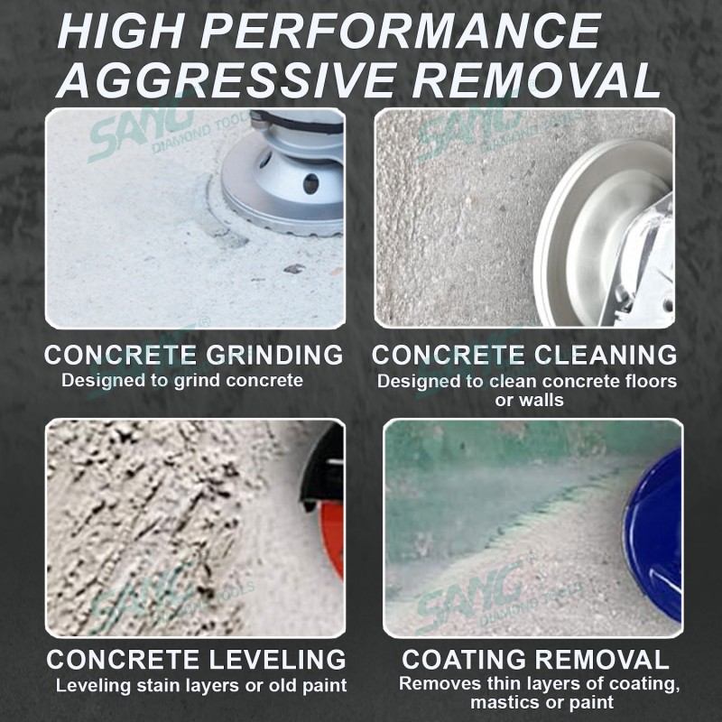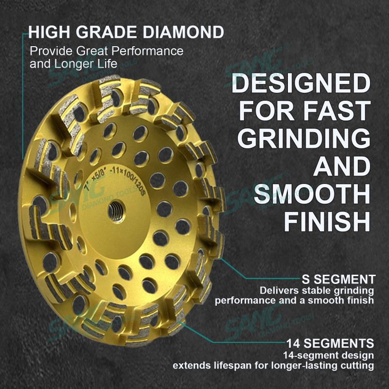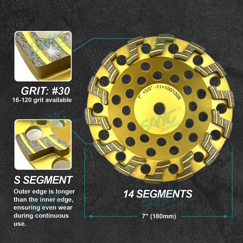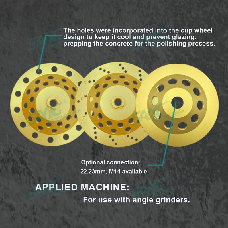 Uso para máquinas rectificadoras portátiles y equipos especiales de recauchutado. se utiliza para biselar, biselar y esmerilar piedra y borde de hormigón y amp; superficie. tamaño de grano: 36 #, 46 #, 60 #, 80 #, 100 #, 120 #, 200 #, como personalizado. hay conexión universal desde φ15 (22.23mm / m14)