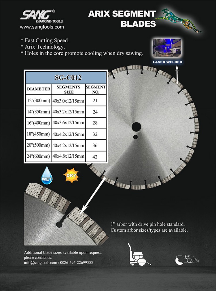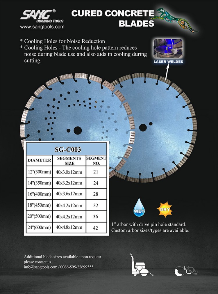 Hoja de corte verde SANG: diseñada especialmente para sierras de entrada temprana con una matriz de unión suave para soportar la abrasividad del hormigón verde.